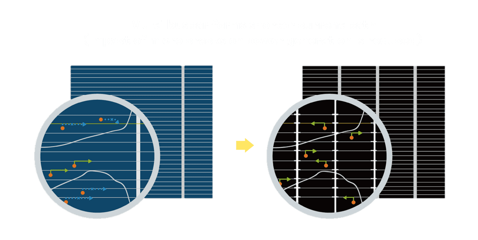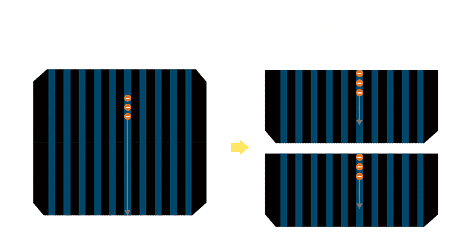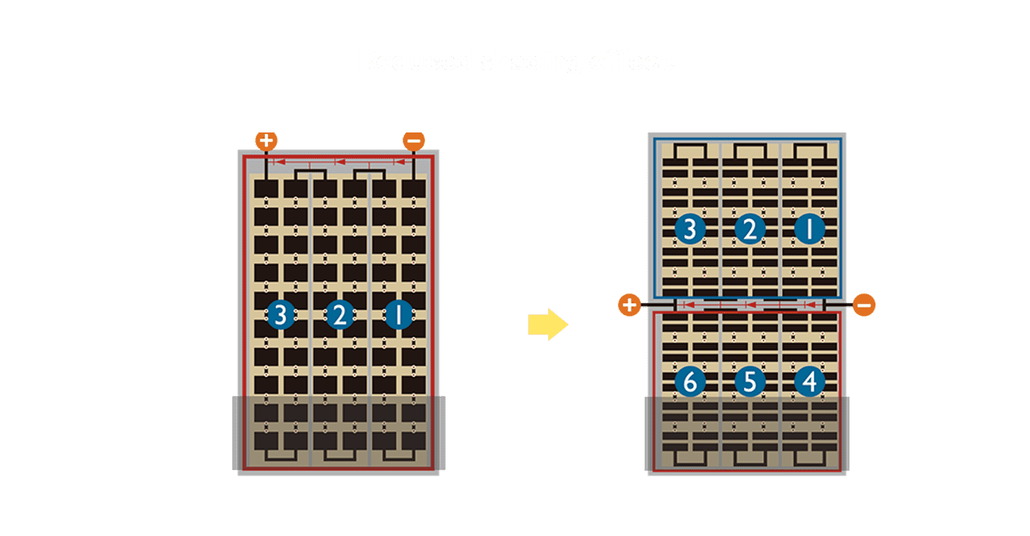 - 结合半切电池,,,降低遮阴影响、、提升模组抗隐裂能力、、、并减少电阻损耗,,,,进一步提升模组发电效能。。。